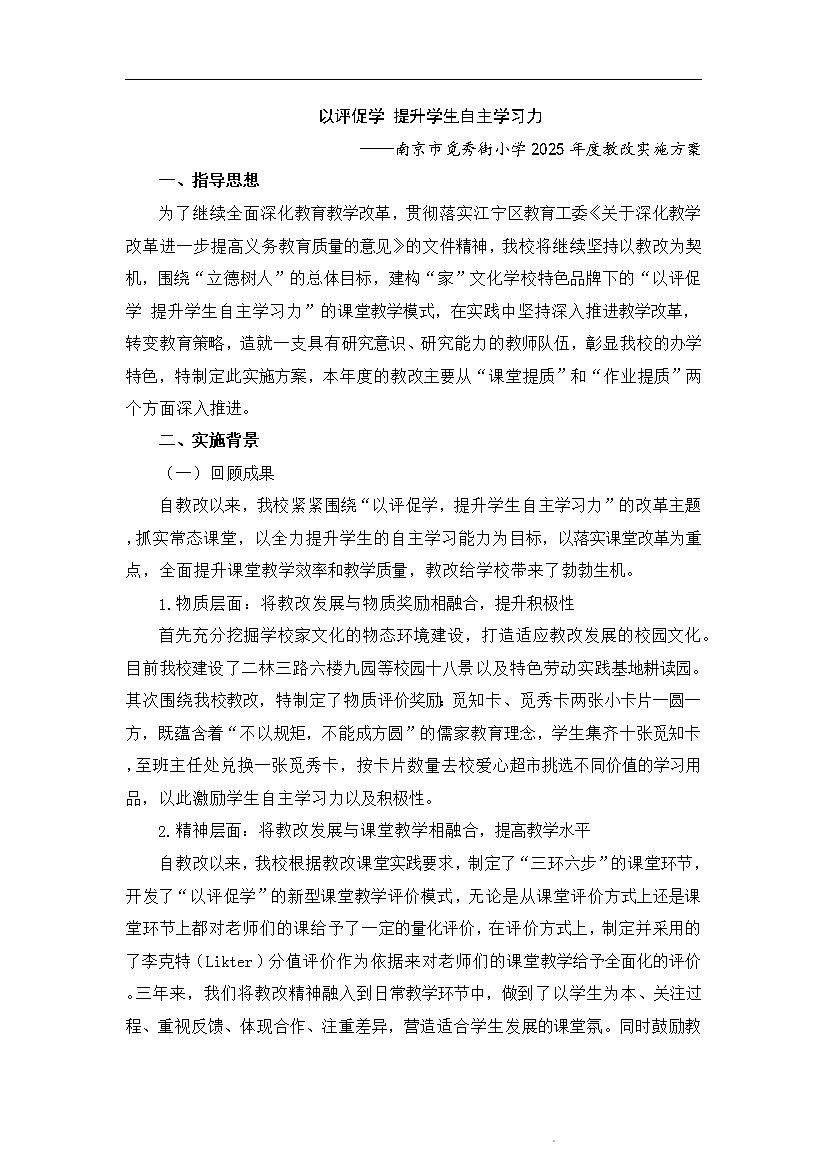 【原】以评促学 提升学生自主学习力 ——南京市觅秀街小学2025年度教改实施方案