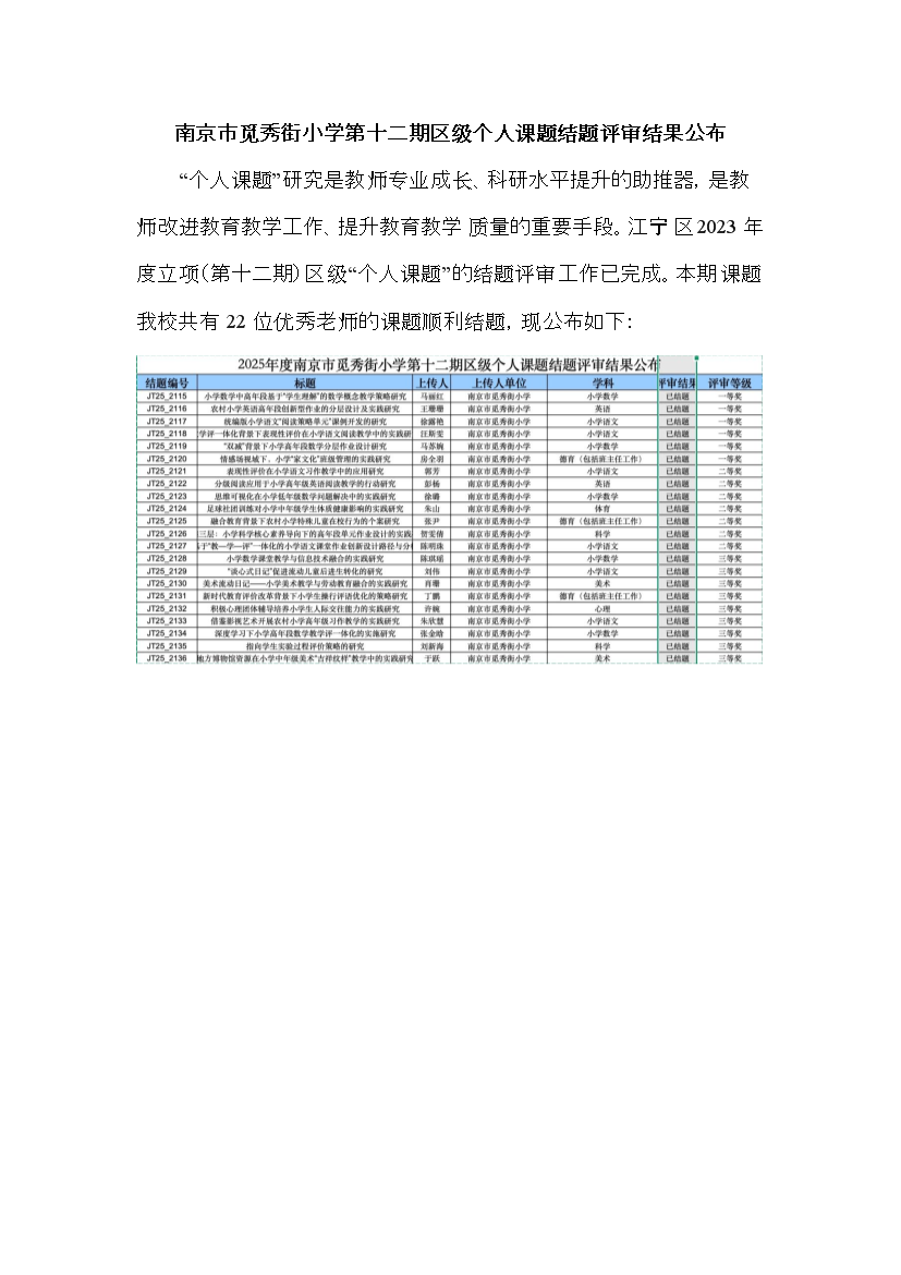 【原】南京市觅秀街小学第十二期区级个人课题结题评审结果公布